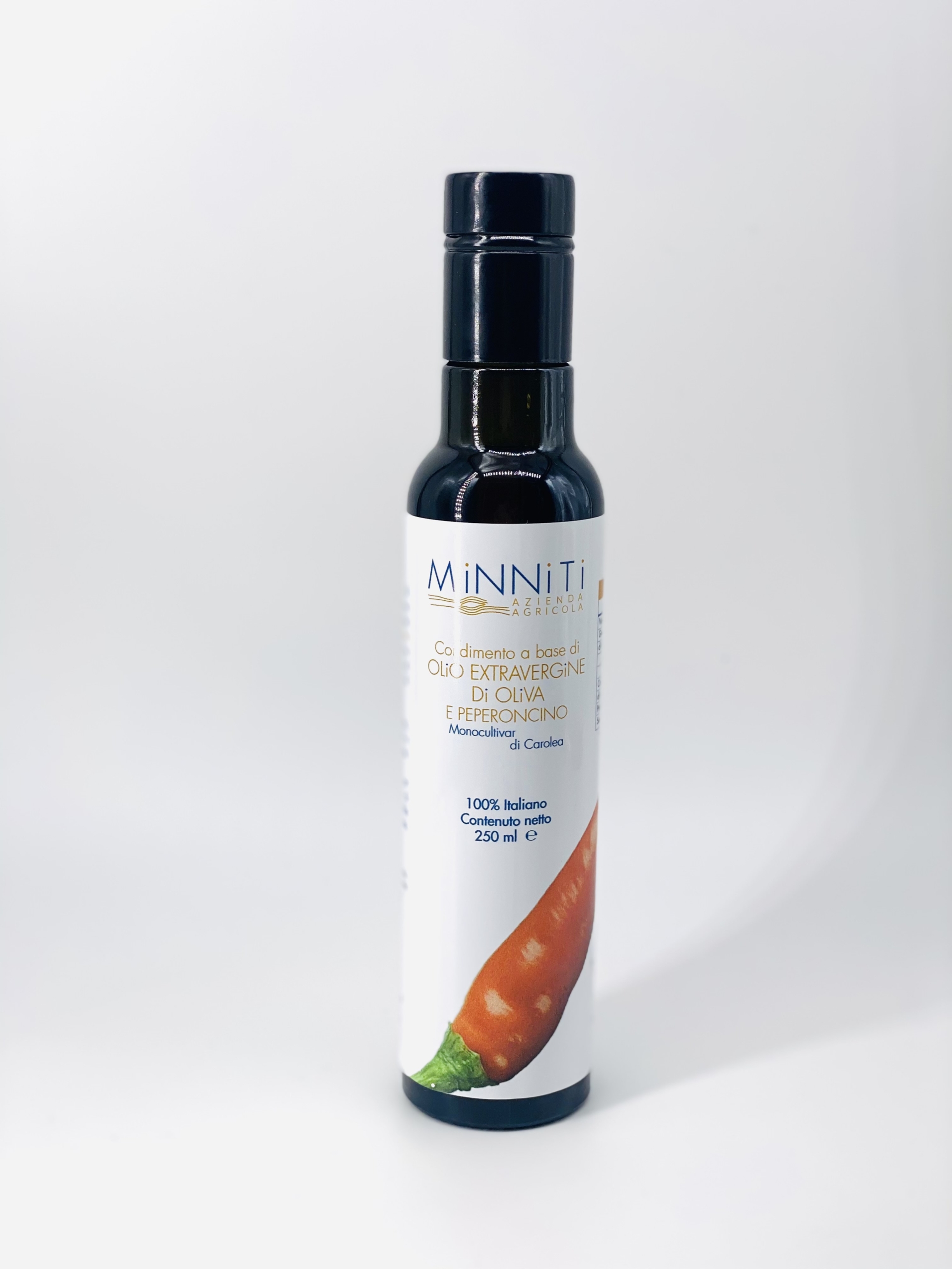 Il condimento di olio extravergine di oliva Carolea e Peperoncino Calabrese viene ottenuto dalla contemporanea molitura di peperoncini e olive.